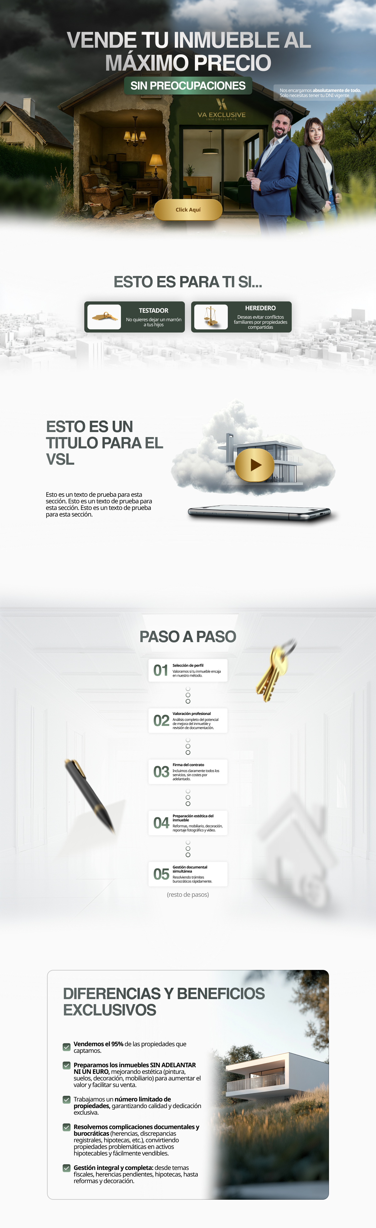 Landing page concept for VA Exclusive, a real estate agency based in Spain. The design highlights the value of property transformation and selling at top market price, using a striking visual contrast and a clear value proposition. The layout was crafted to drive conversions, with a strong call to action and a premium, trustworthy aesthetic.